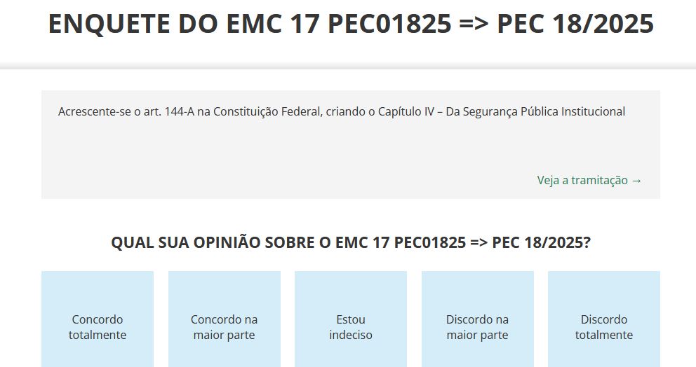 CLIQUE AQUI para acessar a enquete da Câmara dos Deputados e vote “Concordo totalmente” pela aprovação da Emenda 17 à PEC 18/25.