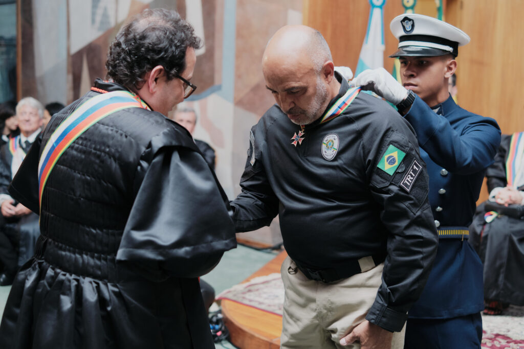 Entre os homenageados esteve o Policial Judicial Marlon Gonçalves Quaresma, condecorado no grau de Comendador, que recebeu o reconhecimento em meio a autoridades dos três poderes e nomes de destaque da área jurídica, acadêmica e institucional.