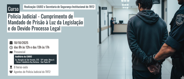 A Escola Judicial do TRT da 2ª Região (EJUD2), em parceria com a Secretaria de Segurança Institucional, realiza na próxima sexta-feira (10), o curso presencial “Polícia Judicial – Cumprimento de Mandado de Prisão à Luz da Legislação e do Devido Processo Legal”, voltado exclusivamente aos Agentes da Polícia Judicial do TRT-2.
